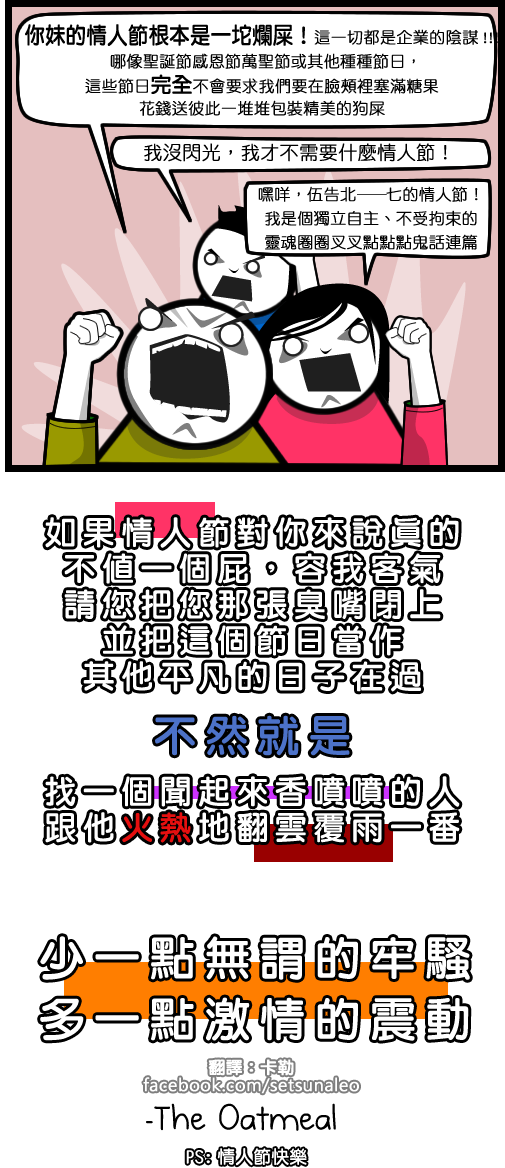 再兩個小時就是二月十四日西洋情人節了,一般來說又是去死團開始撻伐(?)閃光族的時刻。但對於Oatmeal來說,情人節最令人厭惡的事到底是什麼呢?大家一同來看看吧!
